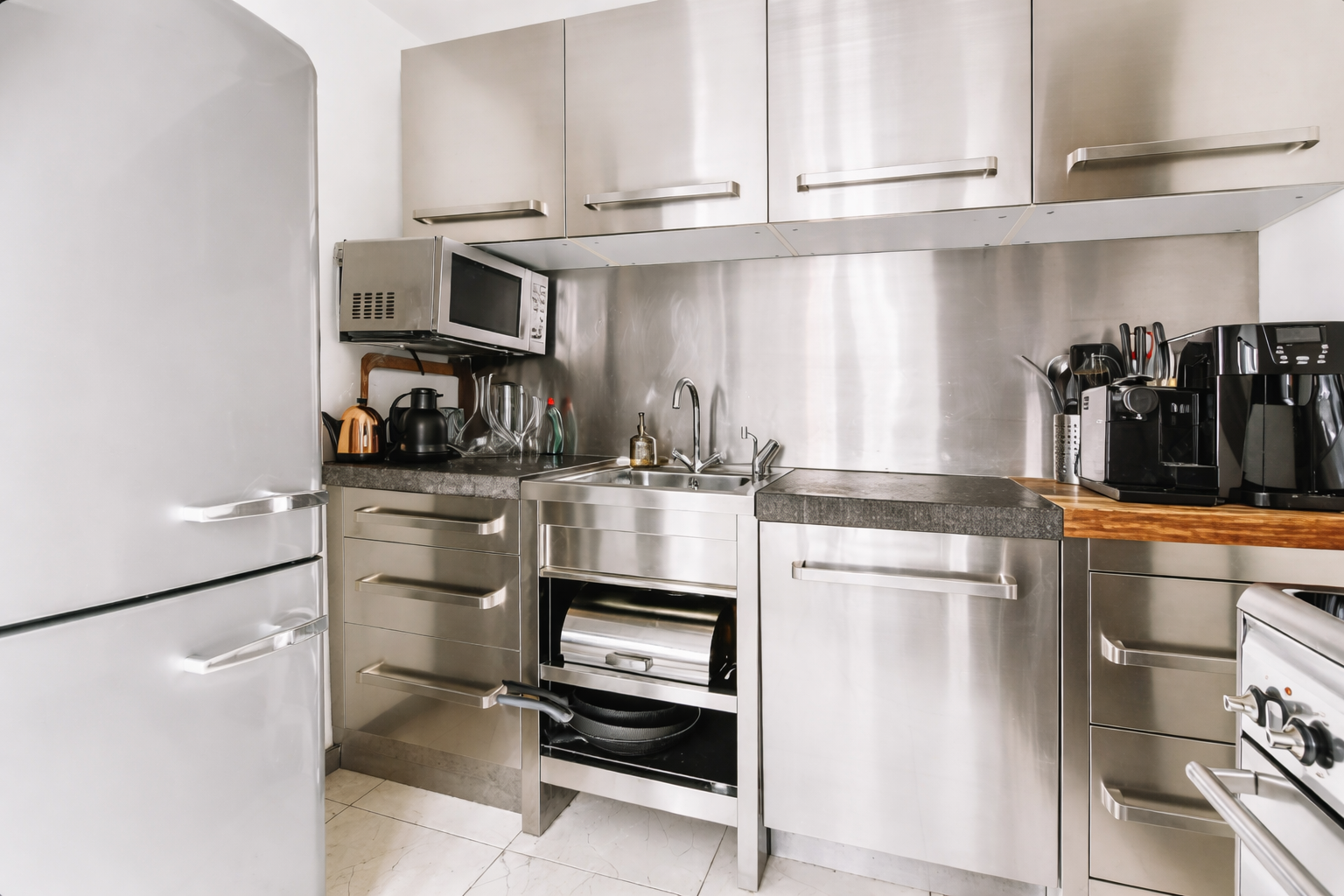 The Model & Finishing section defines the visual appeal and durability of a modern SS Modular Kitchen. A well-designed kitchen requires not only functional layouts but also premium surface finishes that enhance the overall appearance. In stainless steel kitchens, finishing plays a crucial role in delivering a clean, elegant, and long-lasting cooking environment. With advanced manufacturing and precision finishing techniques, each kitchen is crafted to provide both strength and refined aesthetics. The combination of high-quality materials and carefully designed finishes ensures that the kitchen remains stylish while maintaining the natural durability of stainless steel.